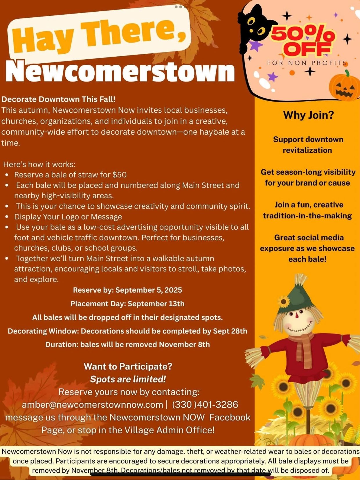 This fall, Newcomerstown NOW is kicking off Hay There, Newcomerstown—a creative downtown decorating program designed to bring color, charm, and community spirit to Main Street. Local businesses, churches, organizations, and individuals are invited to take part in this fun initiative by sponsoring and decorating hay bales that will be displayed throughout our high-traffic areas.